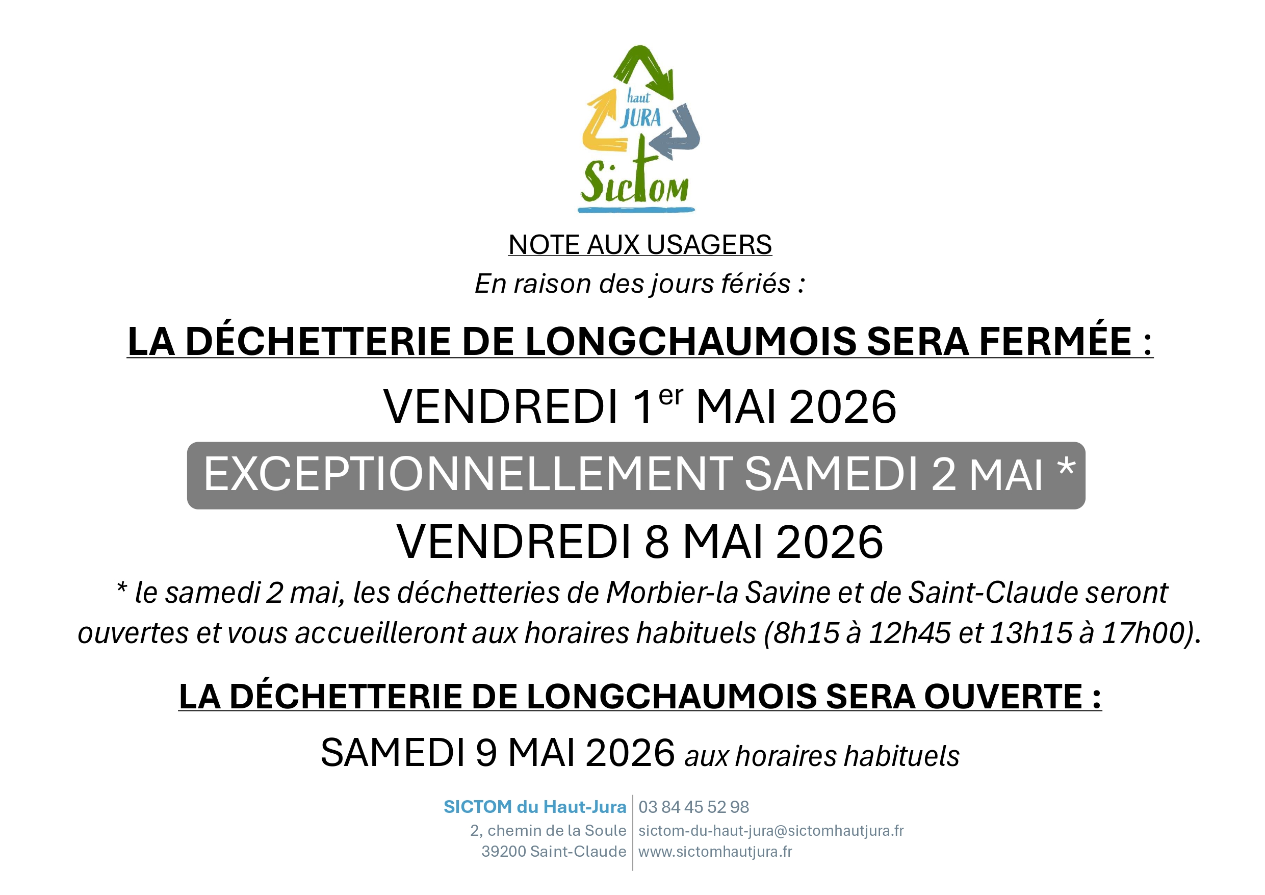• Fermeture de la Déchetterie Samedi 2 mai 2026