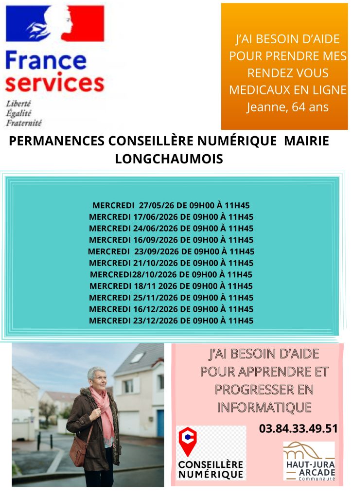 Vous avez besoin de réaliser une démarche sur Internet (impôts, Pôle Emploi, CAF, carte grise, permis de conduire, sécurité sociale …). Les agents de France Services seront en Mairie de Longchaumois les troisième et quatrième mercredis de chaque mois pour vous aider dans vos démarches