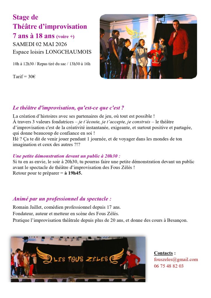 Pour la 3e fois à Longchaumois !Spectacle de théâtre d’improvisationSAMEDI 2 MAI à 20h30 à l'Espace loisirs Les comédien.ne.s vont improviser des histoires sur les titres donnés par le public.Rires et performances garanti.e.s !Spectacle tout public (à partir de 5 ans)Durée = 1h25 (+ 1 entracte de 15 minutes)Tarif unique = 7€Gratuit = - de 13 ans […]
