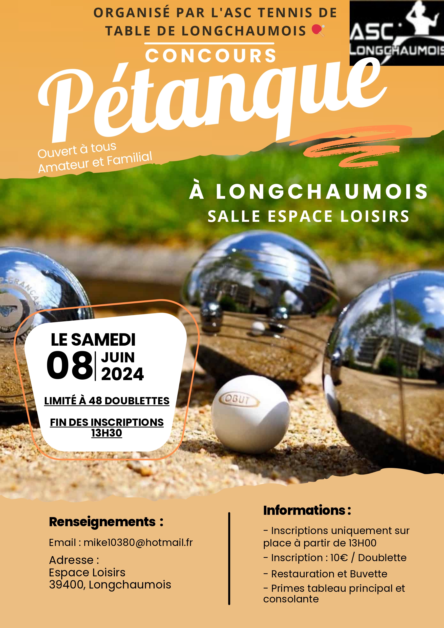 Espace Loisirs Place Espace Loisirs , LongchaumoisConcours de Pétanque organisé par l'ASC Tennis de Table samedi 8 juin 2024