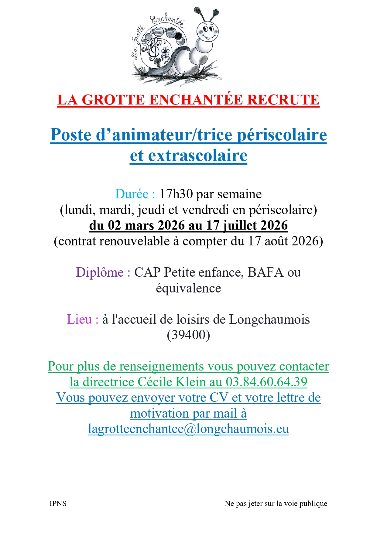 L’Accueil de Loisirs proposent des activités pour les mercredis et vacances (voir plaquettes en téléchargement ). Vous pouvez désormais inscrire vos enfants par email à : lagrotteenchantee@longchaumois.eu